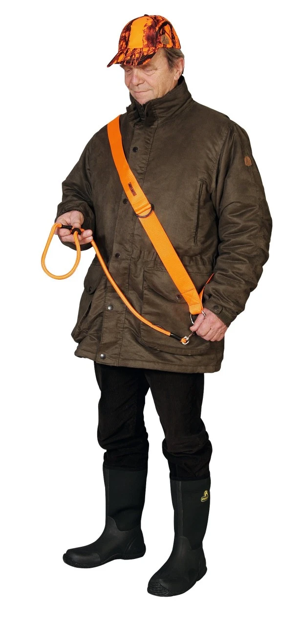 Robust skulderrem, 100 x 5 cm, farve signal orange. Linelængde 120 cm med karabin og sløjfe. Vægt 300 g