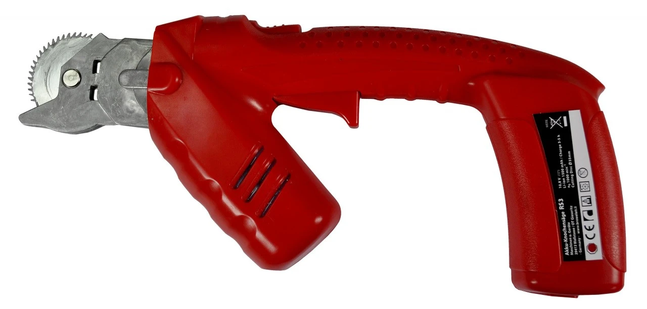 Arbejde som en slagtermester. Håndsav med li-ion-batteri til nem adskillelse af ribbenene fra kroppen. Uden at de brækker. Uden knoglesplinter. Efter opladning er saven klar til brug. Savbladet og løse dele kan rengøres i vand eller med en fugtig klud og desinfektionsmiddel. Inkl. 230 V-oplader, værktøj og smøremiddel i fødevarekvalitet. Vægt 1190 g.