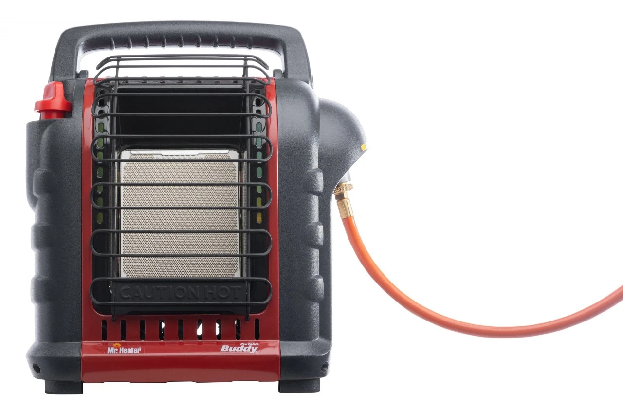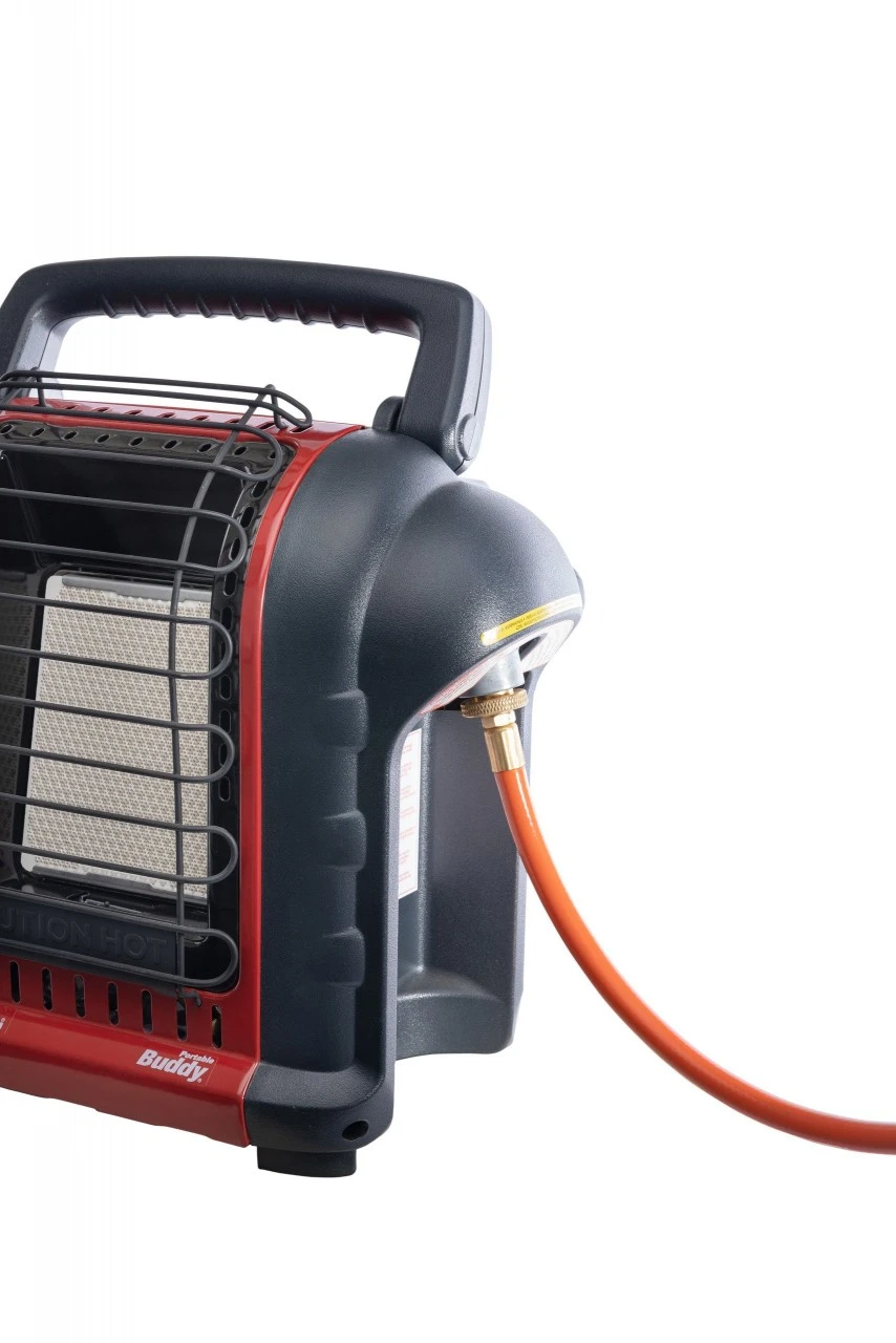 Gas varmeovnen Portable Buddy med slange er egnet til opvarmning af rum op til ca. 21 m². Varmeovnen er udstyret med en drejeknap til temperaturstyring og en automatisk afbrydelse, hvis det vælter, eller der er iltmangel. Den medfølgende slange muliggør en tilslutning til almindelige propangasflasker (medfølger ikke). Mål 361 x 238 x 365 mm. Vægt 3,77 kg.