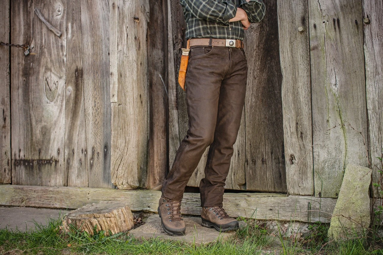 5-lommers jeans i robust nubuck, lavet af nøje udvalgte skind. Perfekt design og håndværk. Dybe lommer og knivlomme, helt i læder. Uden knæ- eller kilesømme. Disse bukser kan endda vaskes i vaskemaskinen, når man bruger en fugtgivende lædersæbe! Ekstra lange bukseben, som tåler individuel afkortning. Leveres uden bælte.