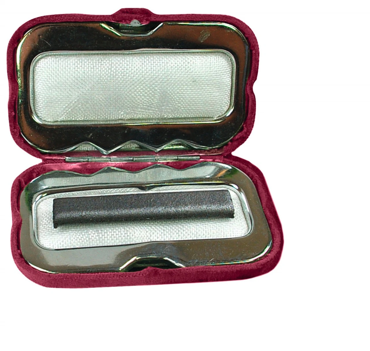 En glødende kulstav leverer energien til denne lommevarmer. Klappet sammen i sit fløjlshylster passer den mellem to håndflader eller i en stor jakkelomme og varmer i flere timer. Lommevarmer med fløjlsbetræk, fløjlspose, kulstav.