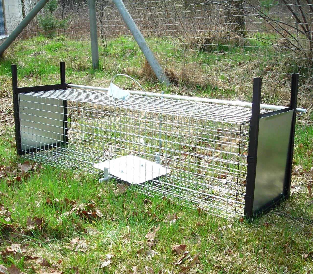 Rovvildtfælde af 3 gange punktsvejset, forzinket tråd. Alle bevægelige dele er af aluminium og ruster derfor ikke. Helt fremstillet i hånden. Med vippebræt. Til praktisk jagt, let, nemt håndterligt og funktionssikkert til mår, ilder og kaniner. Dyret fanges levende.