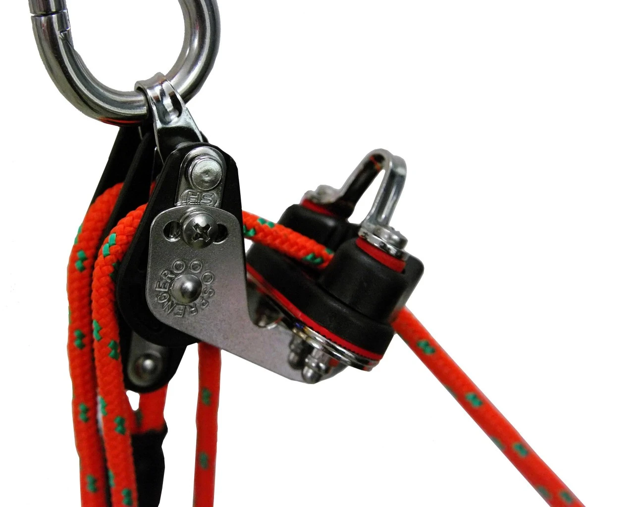 Lækkert trissesystem af høj kvalitet med to dobbelte valser af stærk plast, rustfri stålbeslag og reb, der kan låses med en klemme. Tovværk af polypropylenreb. Reb Ø 6 mm. Reblængde 9 m. Let at bruge – også ved større belastninger op til 150 kg. Vægt 580 g.