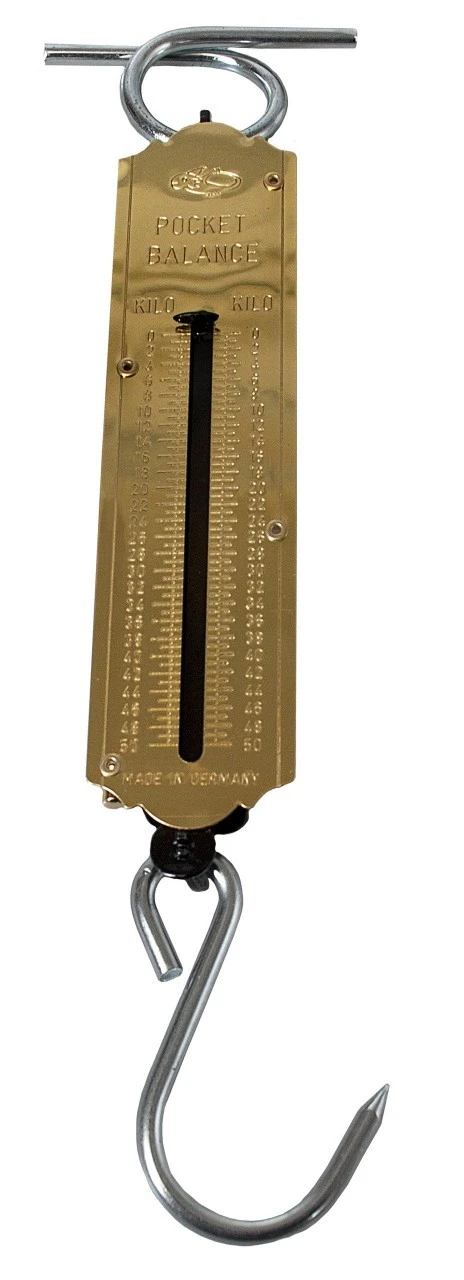 Letmetal fjeder-vægt med håndtag og krog. kan veje op til 50 kg. Mål 35 x 5 cm (håndtag 10 cm). Vægt 300 g.