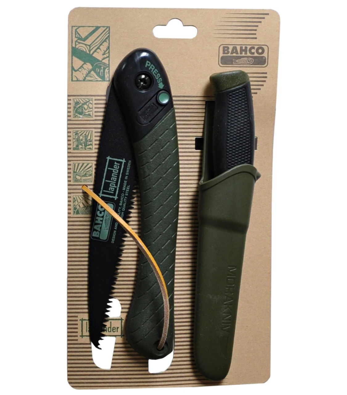 Sæt bestående af Laplander foldesav og kniv. Specielt udviklet til jagt, fiskeri og camping. Sav med ensartet tanding for et hurtigt og præcist snit. Sammenklappet kun 23 cm lang, vægt 175 g. Kniv med 10 cm klinge.