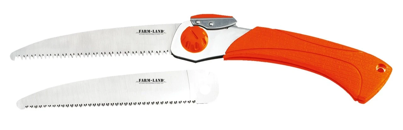 Sav med 2 forskellige klinger af 420 stål. Fin tanding til knogler og grov tanding til træ. Signalorange skridsikkert greb. Greb 22 cm. Klinge 16 cm.