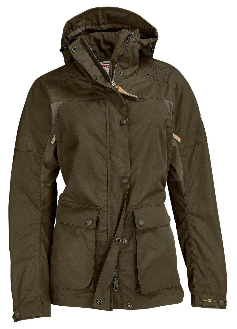 Fjällrävens damejagtjakke Forest Hybrid har to hoftelommer med klap, under begge en stiklomme, og to lynlåsbrystlommer, den ene med en lille mesh-inderlomme.