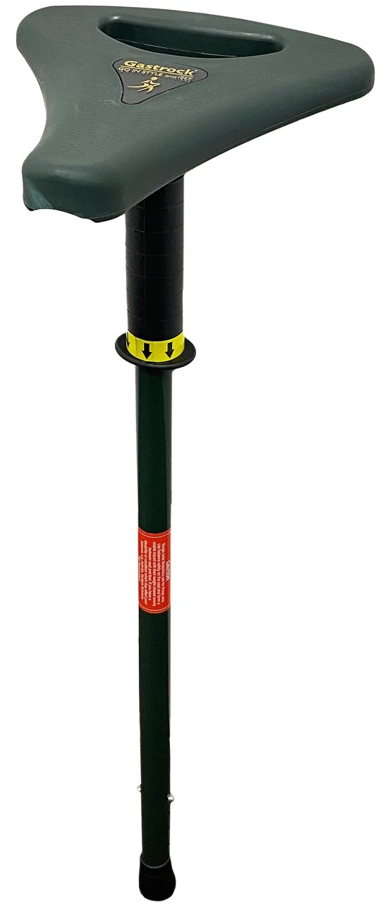 Siddestokken Walker fra Gastrock overbeviser med dens højdejustering i flere niveauer og det stabile sæde, der er formet som en sadel. Når man vil klappe sædet op eller ned, trykker man det sorte kontrolhåndtag ned, hvilket frigør låsemekanismen. Selve stokken er lavet af aluminium med en gummimuffe.