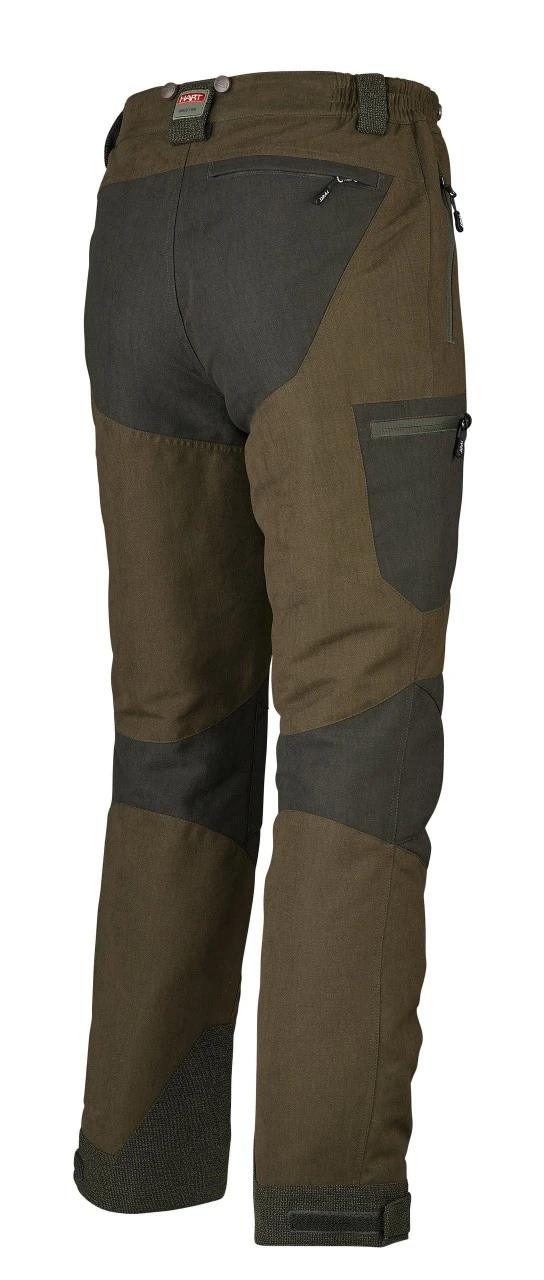 Harts jagtbukser, Lochmor-T, har en behagelig komfortlinning med elastiske indsatser, bæltestropper og seleknapper. Jagtbukserne er udstyret med to stiklommer, to benlommer og en baglomme, alle med lynlås. Lochmor-T har robuste forstærkninger på bagen og anklerne. Anklerne kan justeres med velcro.