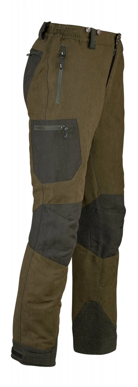 Harts jagtbukser, Lochmor-T, har en behagelig komfortlinning med elastiske indsatser, bæltestropper og seleknapper. Jagtbukserne er udstyret med to stiklommer, to benlommer og en baglomme, alle med lynlås. Lochmor-T har robuste forstærkninger på bagen og anklerne. Anklerne kan justeres med velcro.