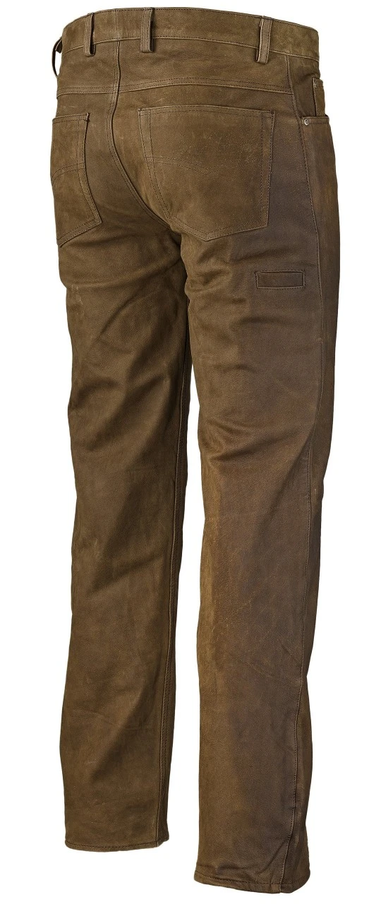 Kvalitetsforarbejdede, klassiske læderbukser med fem lommer, som er lavet af robust bøffellæder med komplet foring. Derudover med knivlomme.