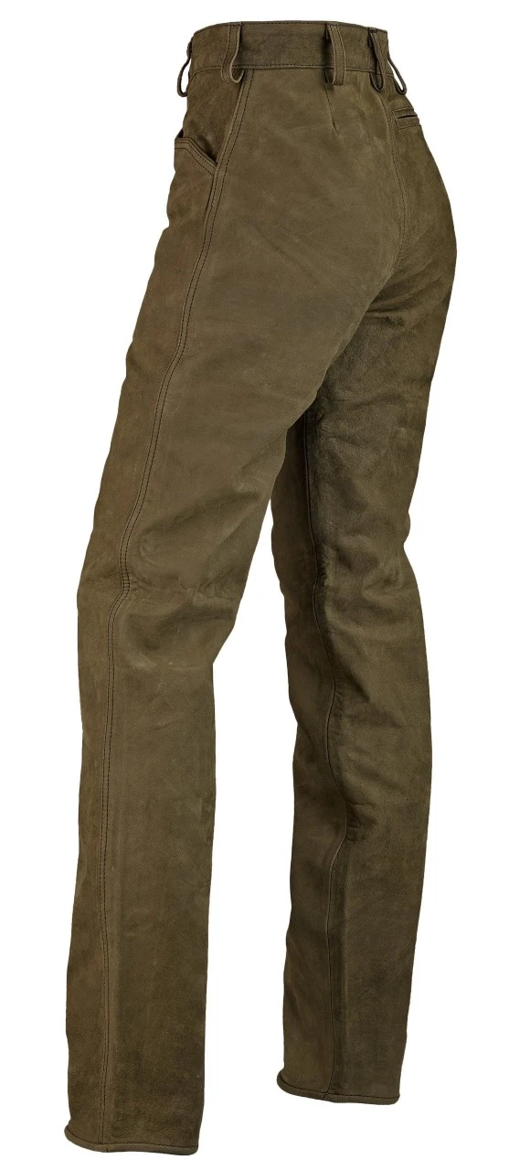 Jagtbukser i høj kvalitet af robust bøffellæder. Smukt forarbejdet i slankt snit med to dybe, paspolerede forlommer, en knivlomme og en baglomme med lynlås. Behagelig at have på med indvendigt for. Leveres uden bælte.