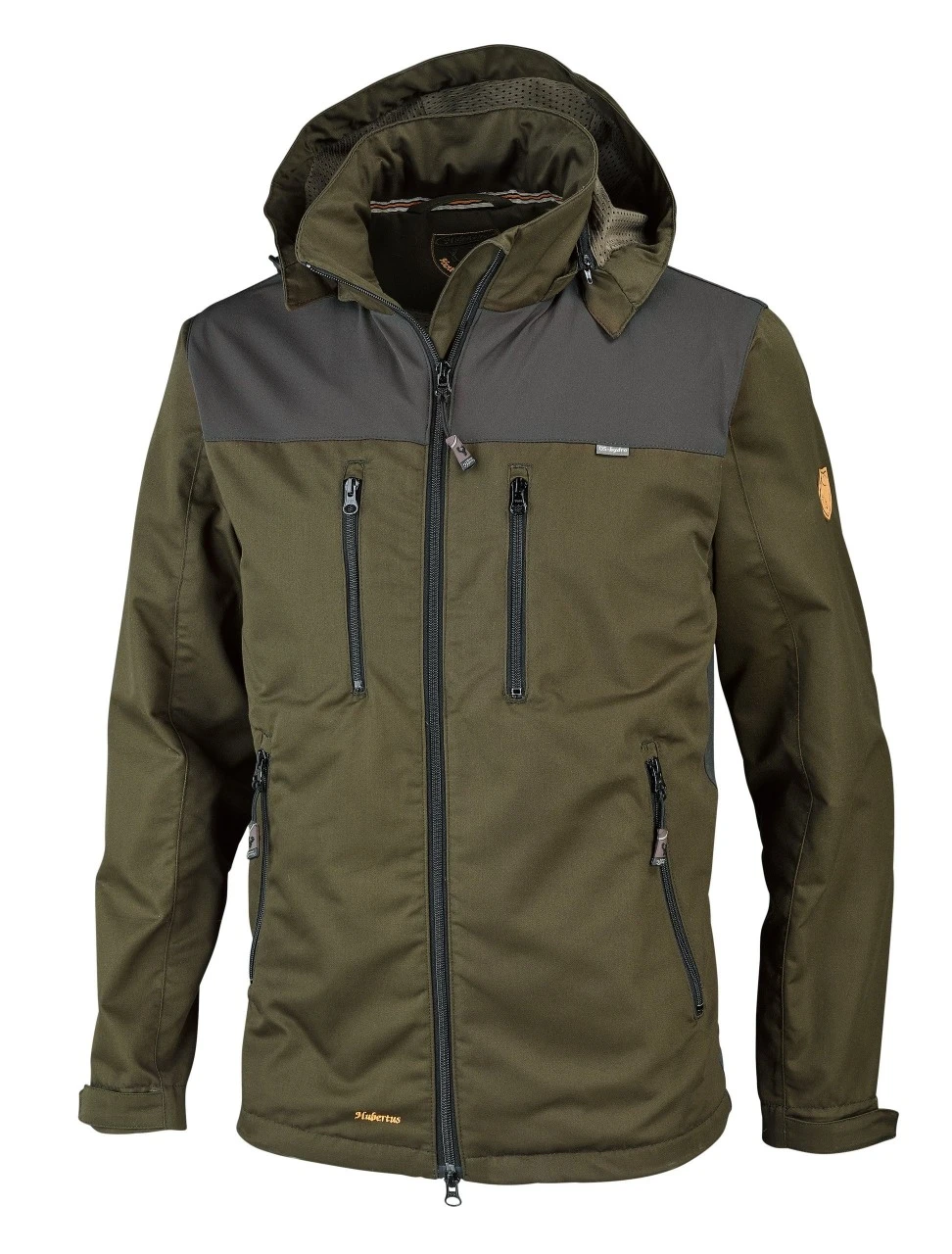 Hubertus mandejagtjakke, Hydro, er udstyret med to lodrette brystlommer, to sidelommer og en indvendig lomme, alle med lynlås, og en harelomme med lynlås i begge sider.
