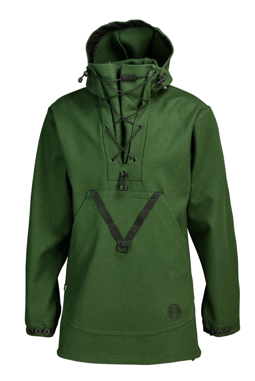 Petromax-herrelodenanorakken Waldmack har en stor kængurulomme med D-ring og en anden kængurulomme indeni med lynlåse på begge sider.