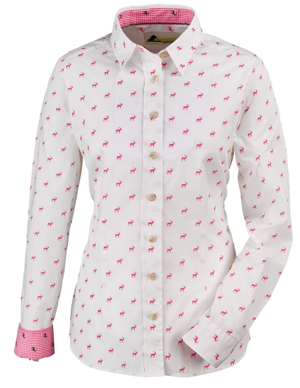 Skogens smarte, langærmede damebluse med hjortemotiv er næsten for lækker til at tage af igen. Det giver dit tøj et trendy, trachtenlook. Perfekt med nederdel, bukser eller jeans.