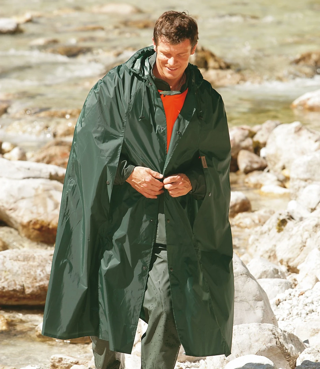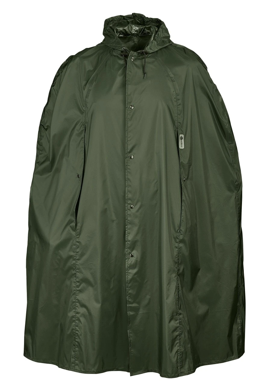Let, vindtæt og vandtæt poncho med praktisk lukning med trykknapper. Komplet svejsning af syningerne. Komfortable ærmegab, stor fold til små rygsække og justerbar hætte.